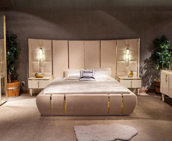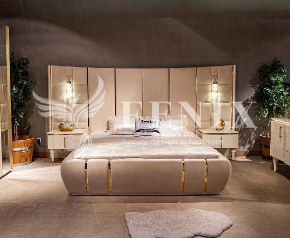 Белая кровать Королева выполнена из сочетания МДФ, мягкой велюровой ткани и декоративный металлических вставок золотого цвета. Изголовье кровати выполнено с легким изгибом, что делает кровать очень оригинальной в интерьере спальни.