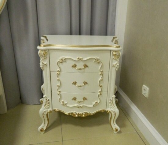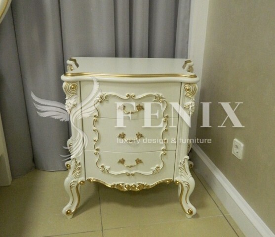 Красивая квадратная прикроватная тумбочка с резными фасадами и золотой патиной в стиле барокко.