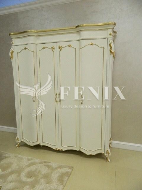 Белый классический шкаф с золотой патиной. Шкаф выполнен из массива натурального дерева и МДФ. Этот шкаф представлен для коллекции Людовик от фабрики Энигма.