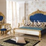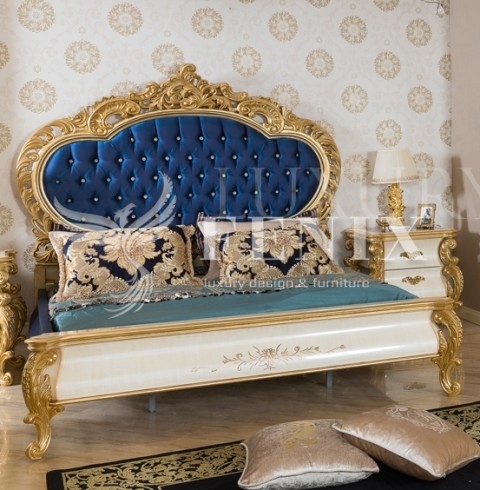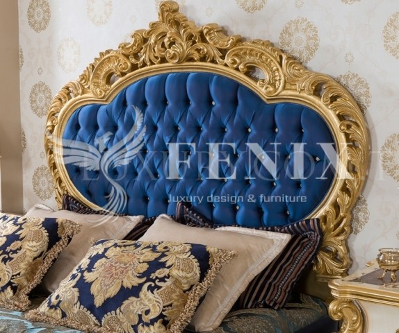 Большая элитная кровать  1800/2000 в стиле барокко выполнена из массива натурального дерева (бук). При желании клиента есть возможность сделать размер 2000/2000. Изголовье кровати оббито синим велюром. Можно поменять цвет изголовья по желанию клиента. Элитная мебель на заказ срок 30 рабочих дней.