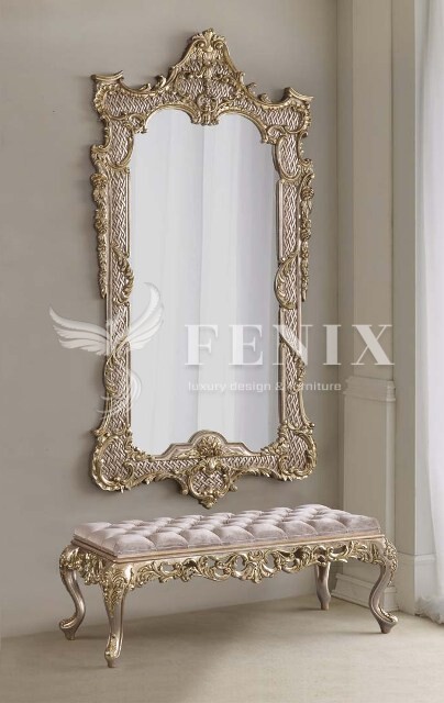 Большое настенное зеркало в резной раме в стиле барокко. Такое зеркало будет красиво смотреться в прихожей, гостиной, спальне. К зеркалу можно приобрести мягкий пуф-банкетку в таком же стиле с резьбой.