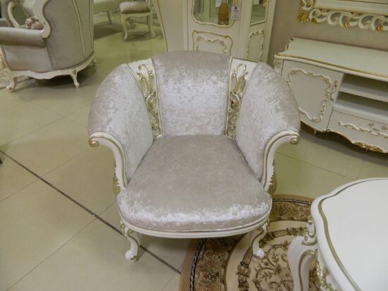 Чайный комплект мебели выполнен из массива натурального дерева и МДФ в белом цвете с золотой патиной. Мягкие кресла выполнены из мягкого красивого велюра в белом или бежевом цвете. Маленький приставной столик небольшого размера тоже можна подобрать такой как на фото или выбрать подобную модель.