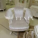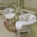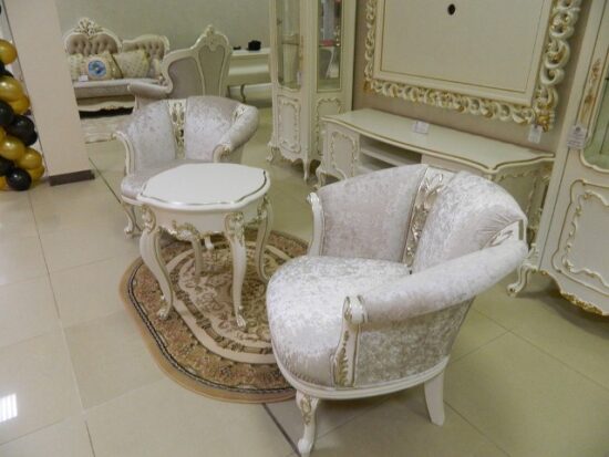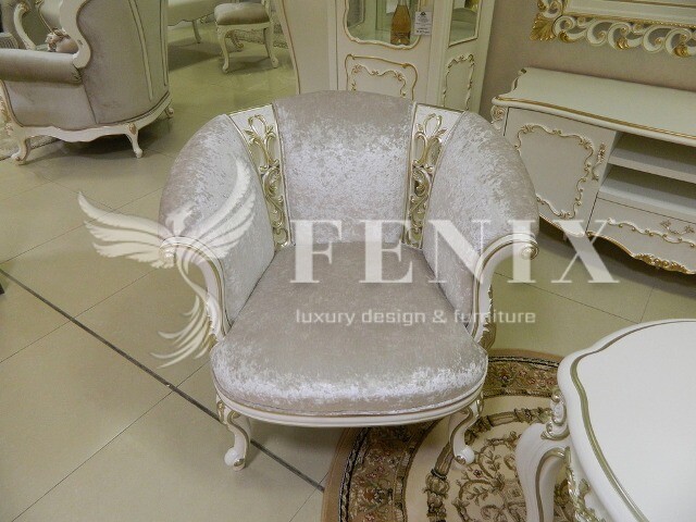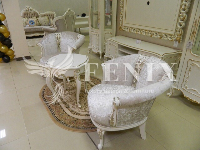 Чайный комплект мебели выполнен из массива натурального дерева и МДФ в белом цвете с золотой патиной. Мягкие кресла выполнены из мягкого красивого велюра в белом или бежевом цвете. Маленький приставной столик небольшого размера тоже можна подобрать такой как на фото или выбрать подобную модель.