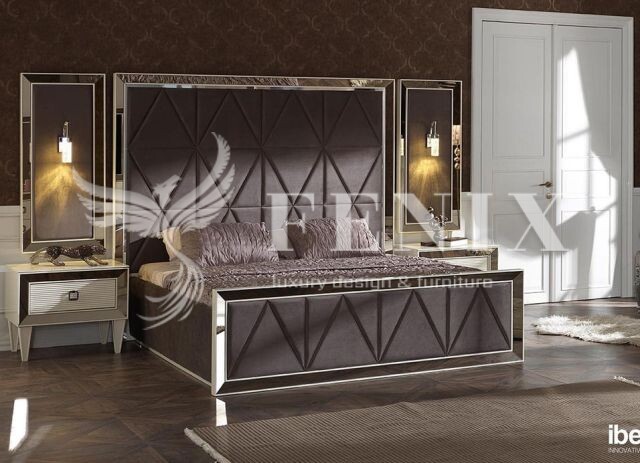 Двухспальная кровать выполнена в сером велюре в технике каретная стяжка с узором трехугольник. Дополняет изголовье кровати зеркальные панно с тумбочками прикроватными, что создает красивый комплект для спальни в стиле АРТ-Деко.