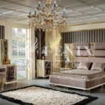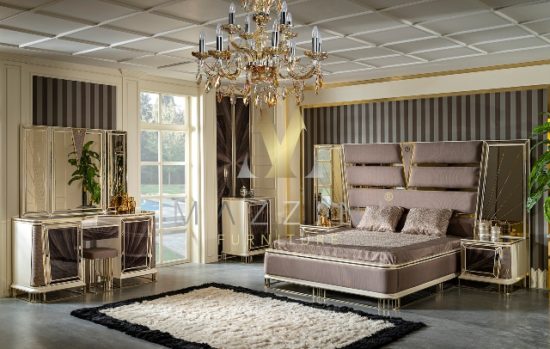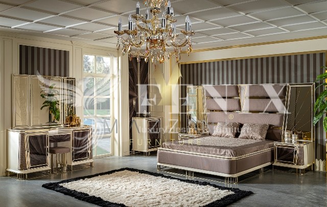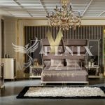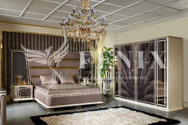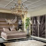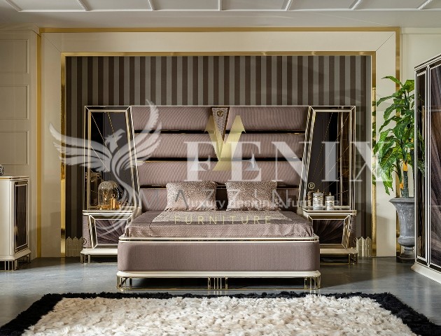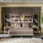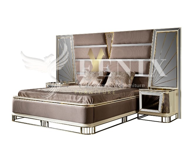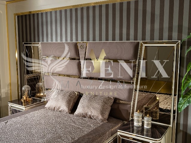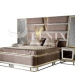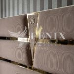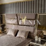 Элитная кровать со спальным местом 1800*2000 с высоким изголовьем. Изголовье красиво отделано тканью с металлическим золотым и зеркальным узором.