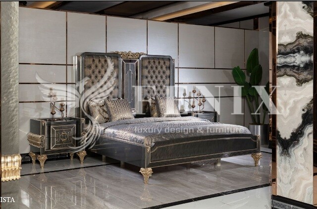Элитная двухспальная кровать с мягким изголовьем выполнена из комбинации натурального дерева и МДФ. Эта коллекция мебели сочетает в себе слияние стилей- классика и АРТ -Деко. Изголовье кровати оббито дорогой тканью в стиле капитоне и каретная стяжка сочетается с декоративными резными узорами с позолотой. Кровать без изножья на золотых резных ножках.