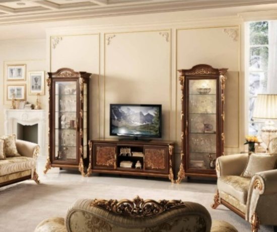 Элитная мебель производства Италия от фабрики Аредоклассик. Мебель выполнена из массива натурального дерева и мебельной плиты. На фасадах мебели видны красивые узоры текстуры дерева. Мебель не повторяет узоры фасадов. На резные части нанесена патина- золото.