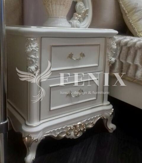 Квадратная прикроватная тумбочка с патиной шампань (белое золото). Красиво подчеркнет интерьер и подойдет к кровати Шампань. Тумбочки меньше размером, чем дутые по размеру и могут стать в интерьер в комнату меньше по размеру.
