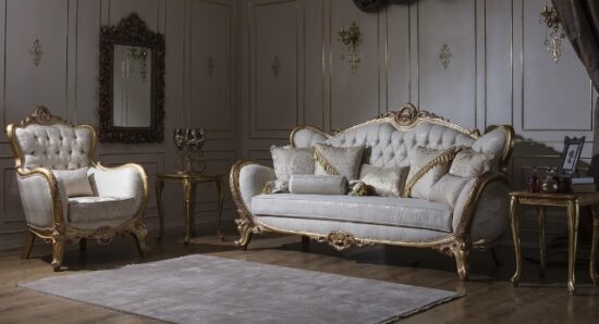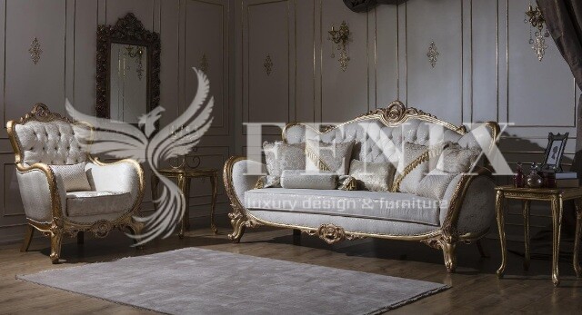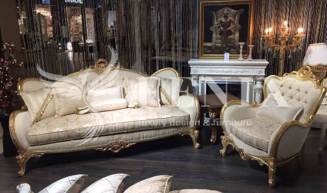 Набор мягкой турецкой мебели в золотых деревянных каркасах. Мебель изготовлена из натурального дерева и покрыта золотой поталью. Золотая поталь красиво сочетается с бежевой оббивкой дивана, что делает этот комплект мягкой мебели красивым и элитным. В этой модели дивана снимается спинка, что дает возможность заносить с легкостью мебель. Вы можете заказать только диван или полный комплект- диван, 2 кресла и столик.