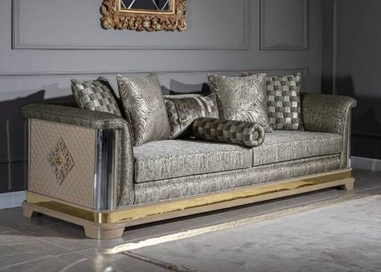 Прямой диван с креслами от турецкой фабрики производителя. Диван и кресла изготовлены из массива натурального дерева с декоративными отделками из МДФ. К дивану и креслам сможете подобрать журнальный столик в этом же стиле.