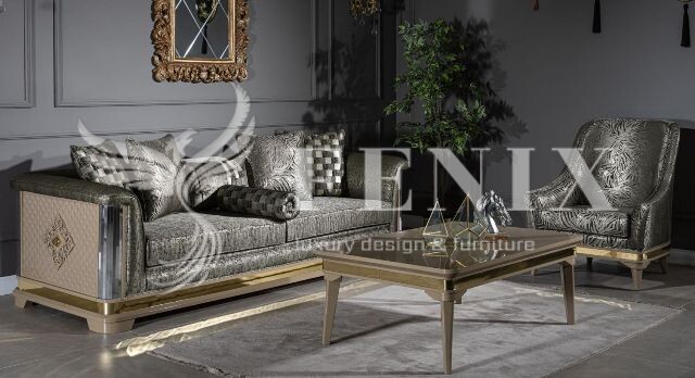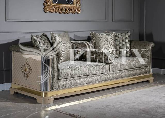 Прямой диван с креслами от турецкой фабрики производителя. Диван и кресла изготовлены из массива натурального дерева с декоративными отделками из МДФ. К дивану и креслам сможете подобрать журнальный столик в этом же стиле.