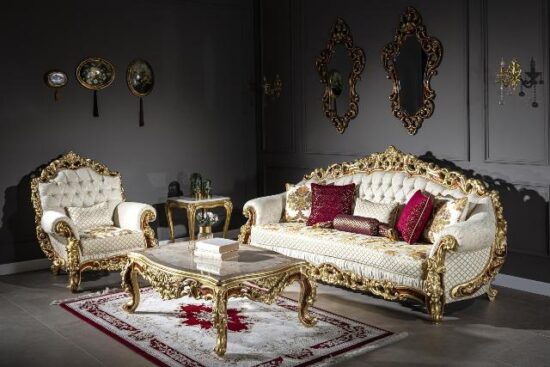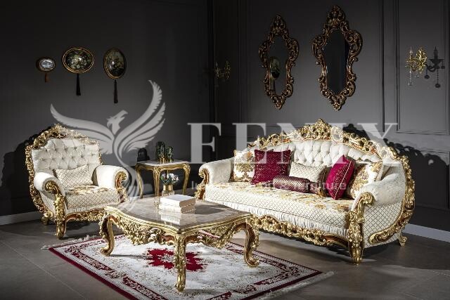 Элитный золотой классический набор мягкой мебели в гостиную, холл, зал. Турецкие диван и кресла в стиле барокко на цельном деревянном каркасе. Диван не разборной и не раскладной поэтому четко смотрите размеры для заноса в квартиру. Для оббивки мягкой мебели используются дорогие ткани в классическом стиле.