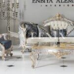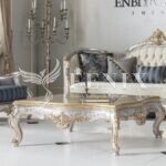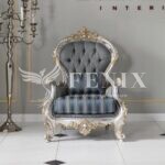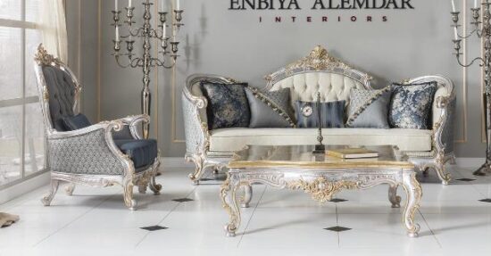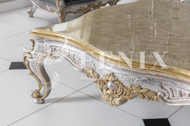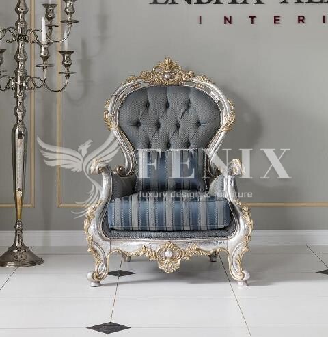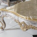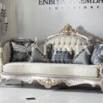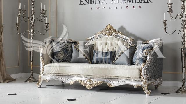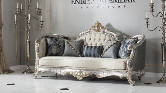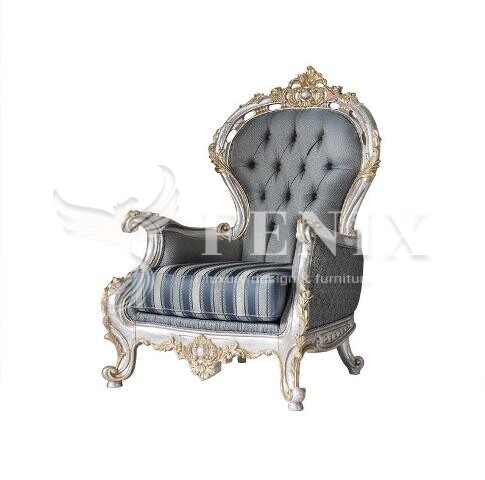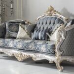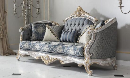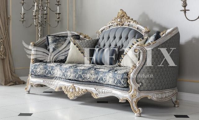 Классический диван в стиле барокко с красивой резной спинкой. Диван сделан полукруглым — студийным. Такой диван может устанавливаться как у стены так и в центре комнаты.
