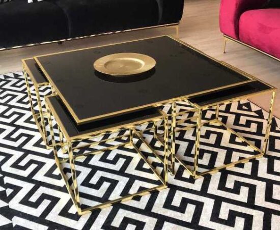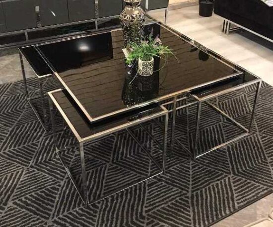 Квадратный столик на металлической золотой (серебряной) основе. Поверхность (столешница) стеклянная черного цвета. К этому столику можно взять дополнительно маленькие столики которые создают полный ансамбль и комплект. Такой набор маленьких журнальных столиков прекрасно подойдет в интерьер гостиной в стиле модерн или АРТ-Деко. Столики станут украшением гостевой зоны в салонах красоты, ресторанах и зон ожидания в ВИП зонах.