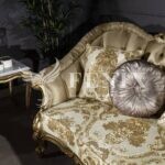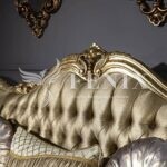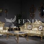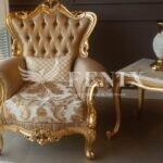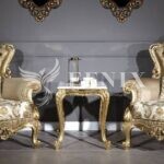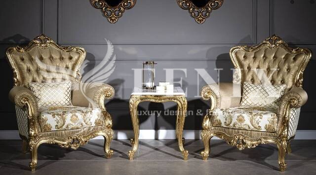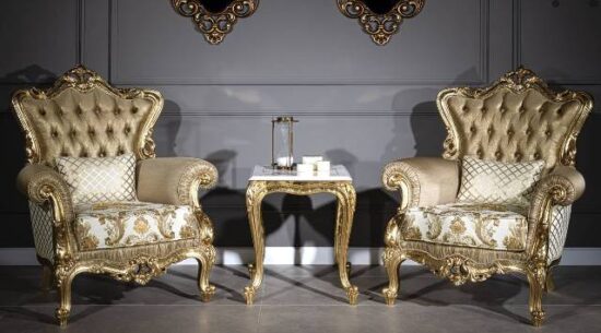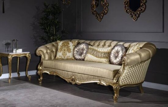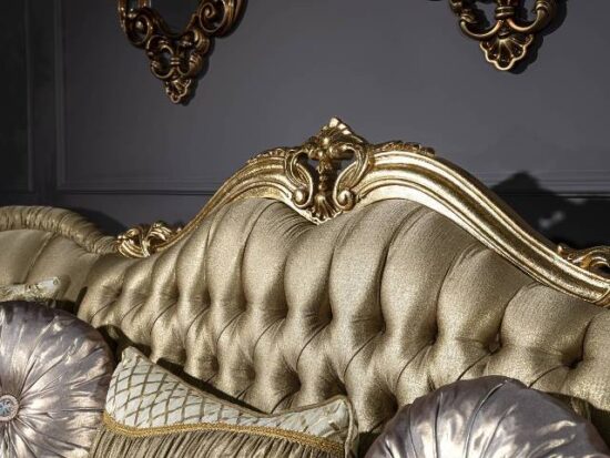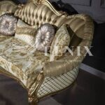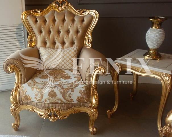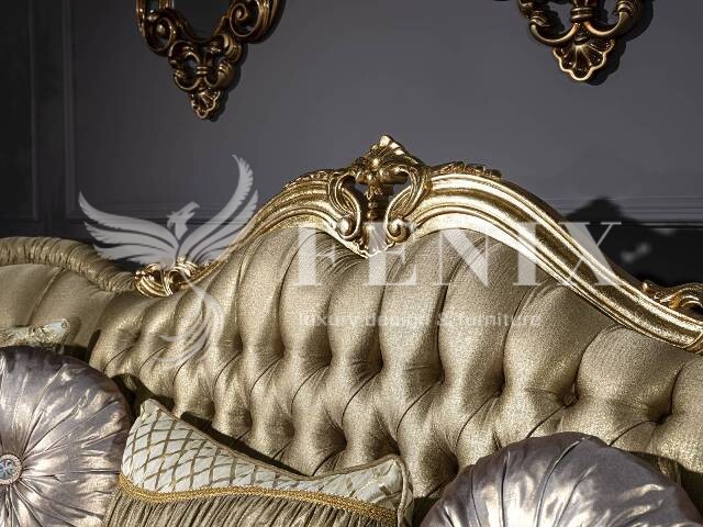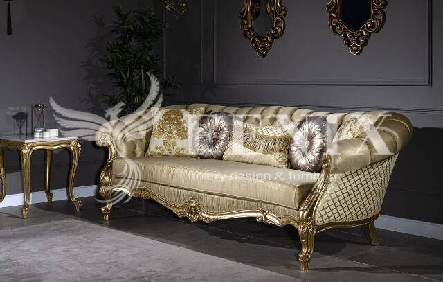 Мягкая турецкая мебель в золотом цвете. Мебель изготовлена из натурального дерева и покрыта золотой поталью. Золотая поталь красиво сочетается с золотой оббивкой дивана, что делает этот комплект мягкой мебели красивым и элитным. Такая мягкая мебель будет актуально смотреться в гостиной, в зале, в большой прихожей.
