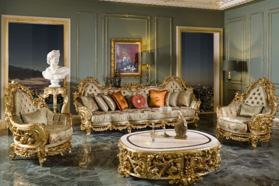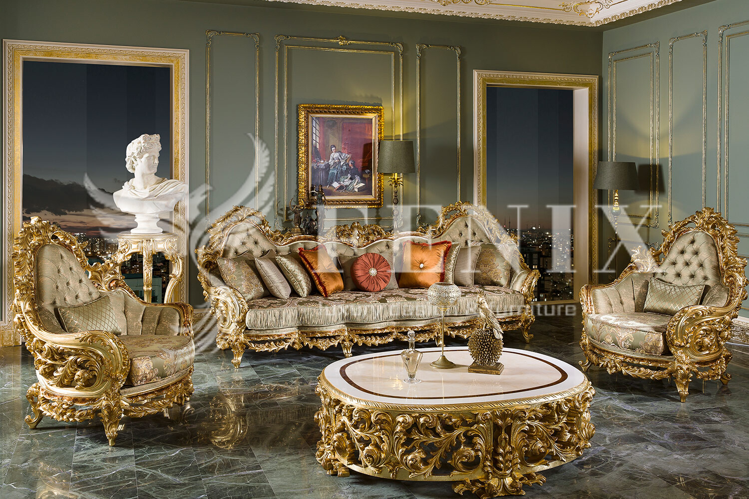 Элитный резной диван с креслами SOCCI для гостиной красиво дополняет овальный резной столик на золотой резной ножке. Этот комплект выполнен из натурального дерева на цельных резных каркасах. Оббивку Вы сможете выбрать по каталогу тканей. Также цвет дерева можно подобрать — золото, серебро, орех, белый, крем.