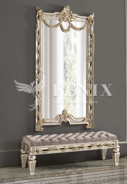 Классический набор для прихожей, коридора с элементами барокко. Большое настенное зеркало в красивой раме с золотой патиной украсит интерьер Вашего дома. Пуфик- банкетка будет красиво смотреться как в прихожей так и будет дополнительным элементом мебели для спальни.