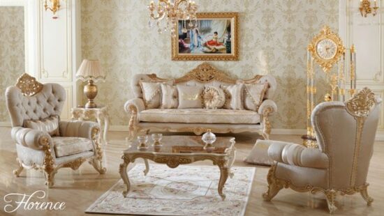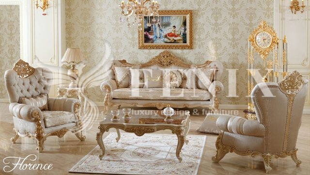 Классический набор мягкой мебели в холл, гостиную, кабинет. Мебель выполнена на цельных каркасах из натурального дерева. Деревянные каркасы покрыты золотой поталью ( при желании клиента корпус можно изготовить в любом цвете). Красивые резные формы диванов дополняют изысканные ткани.
