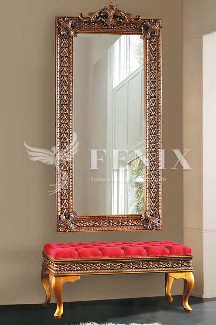 Винтажный набор мебели для прихожей в цвете антик -зеркало в декоративной резной раме и мягкий пуфик — банкетка. Такой набор можно выполнить в любом цвете- золото, серебро, орех, белый. Или дополнительно нанести патину на определенный цвет.