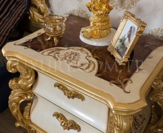 Прикроватная тумбочка в стиле барокко Квин выполнена из массива натурального дерева. Резные части мебели покрыты золотой паталью, что придает тумбочке королевской красоты в интерьере. Столешница тумбочки выполнена в технике интарсия ( декоративная мозаика по дереву). Белые фасады покрыты дорогим лаком и имеют глянцевый блеск, что придает еще более богатый вид мебели.