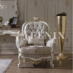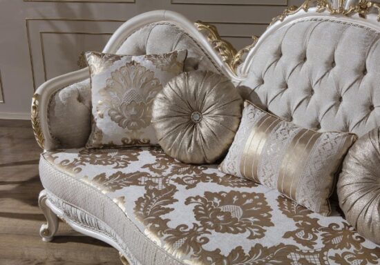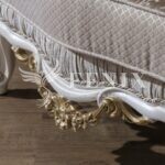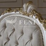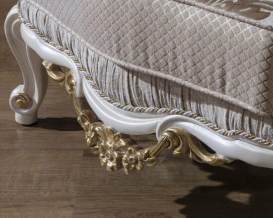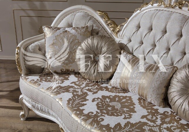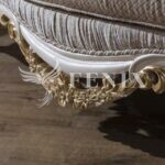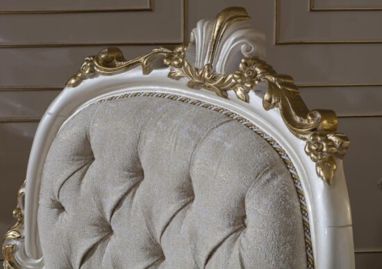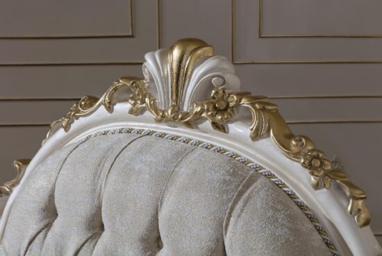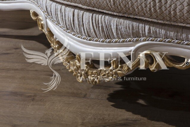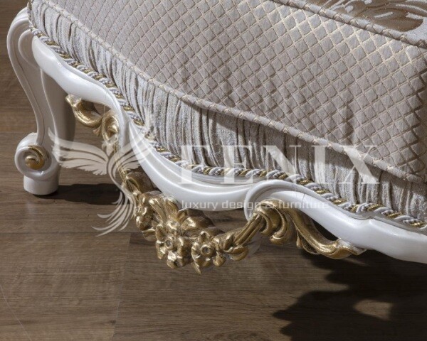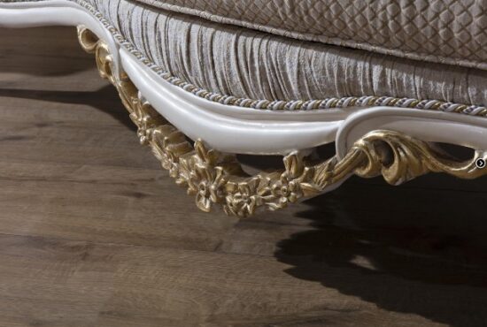 Классический диван в стиле барокко с красивой резной спинкой. Спинка сделана в стиле капитоне и украшены декоративными пуговицами ( по желанию клиента можно вместо пуговиц установить стразы). Интересный дизайн спинки за счет выгнутой дугой деревянной планки и украшеной коронами.