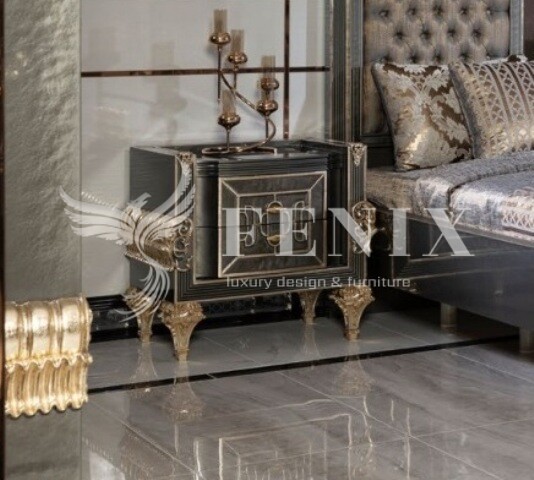 Красивая прикроватная тумбочка в стиле АРТ-Деко выполнена из МДФ в сером цвете с золотым декором. Тумбочка на 2 ящика на резных золотых ножках в золотыми накладками на фасадах.