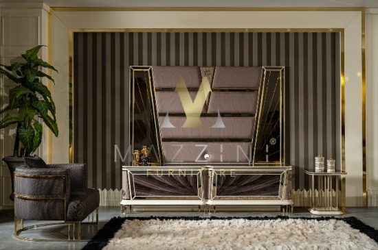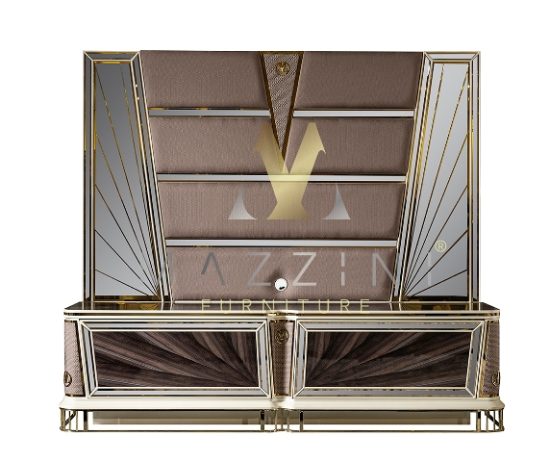 Стильная ТВ тумба с декоративным панно выполнена из МДФ и метала. Мебель красиво подчеркнет интерьер гостиной в стиле АРТ-Деко или модерн. Покрытие в цвете -зебрано в бежево-розовых тонах. Декоративные отделки металлом золотого цвета с зеркальными вставками.