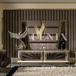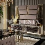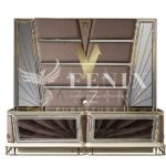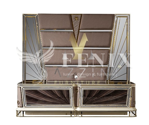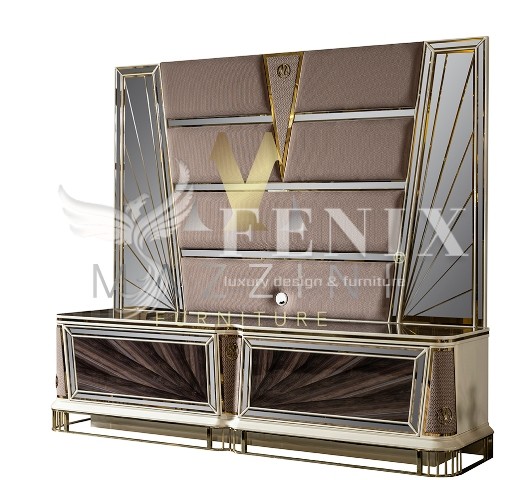 Стильная ТВ тумба с декоративным панно выполнена из МДФ и метала. Мебель красиво подчеркнет интерьер гостиной в стиле АРТ-Деко или модерн. Покрытие в цвете -зебрано в бежево-розовых тонах. Декоративные отделки металлом золотого цвета с зеркальными вставками.