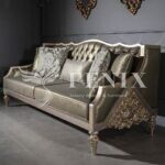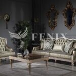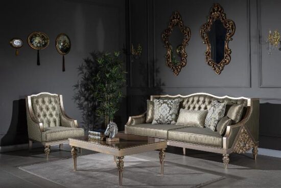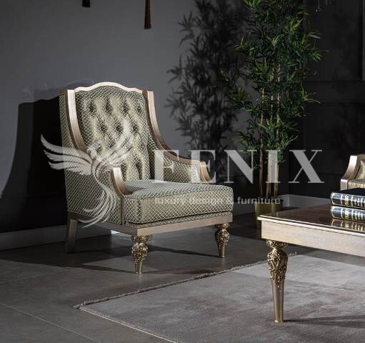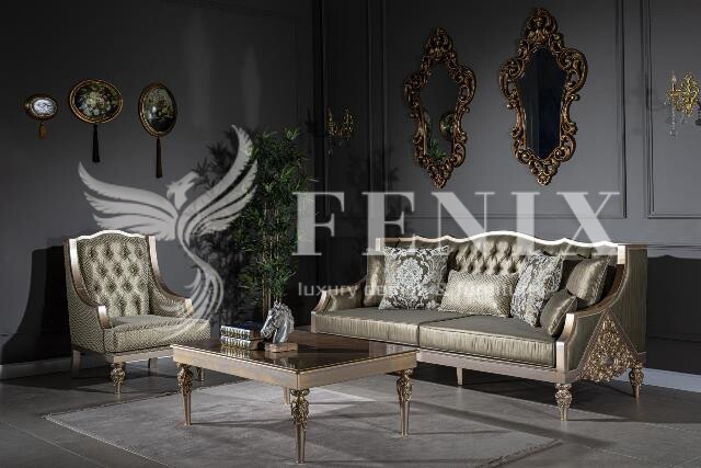 Набор мягкой классической мебели в зал на деревянных цельных каркасах. Такой набор мебели хорошо подчеркнет интерьер в классическом стиле с элементами АРТ-Деко. Деревянные каркасы выкрашены в серебряно-золотой цвет ( антик). И в такой же цветовой гамме подобрана обивочная ткань. При желании клиента диван можно выполнить в любом цвете.