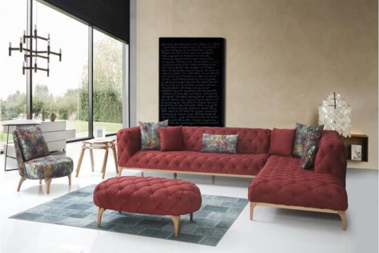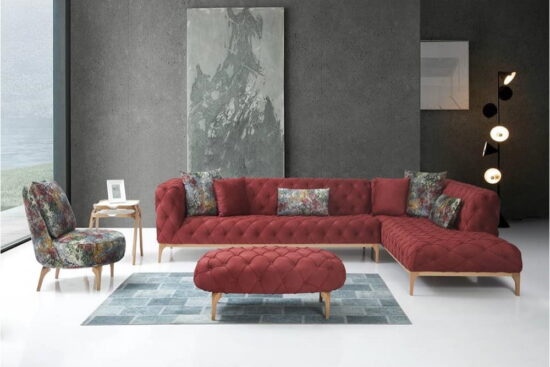 Набор мягкой мебели секрет состоит из углового диван, пуфа , акцентного кресла. Такая мягкая мебель прекрасно подойдет по своему дизайну для ресторанов, кафе, кальянных и летних площадок кафе. Диван изготовлен на деревянном каркасе в дорогой красной ткани (оббивку — тип ткани и цвет Вы сможете подобрать по каталогу).