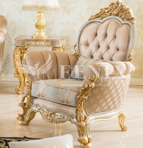 Элитное деревянное кресло в стиле барокко Квин изготовлено из массива натурального дерева оббито золотой тканью с вензелями, что делает это кресло все более дорогое. Деревянная элитная мебель из дерева. Классическая мягкая мебель с золотом для гостиной.