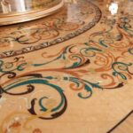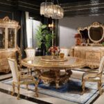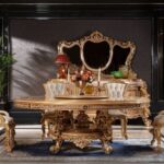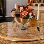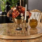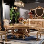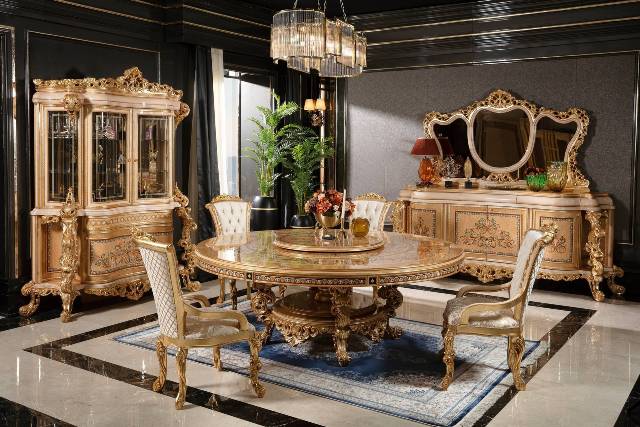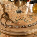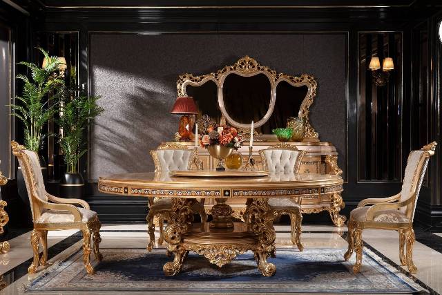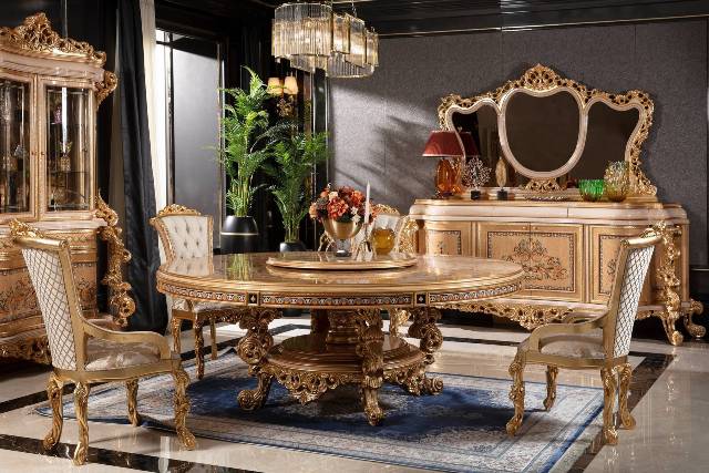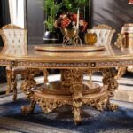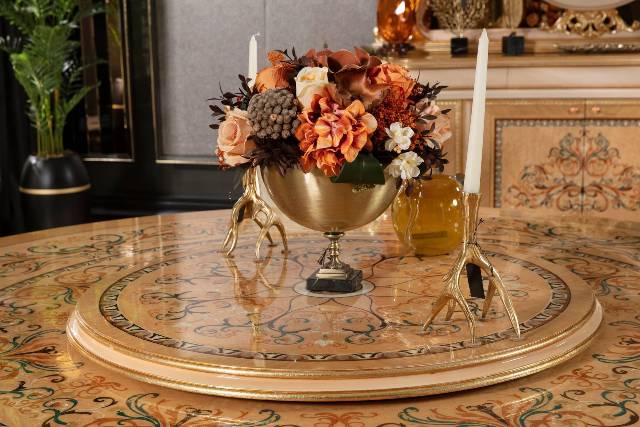 Красивый обеденный стол в большом размере. Стол круглый диаметром 2200. Столешница красиво украшена цветочными узорами на столешнице. Стол сделан в стиле барокко в золотом цвете.