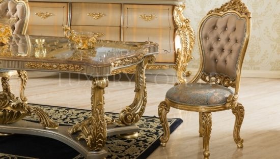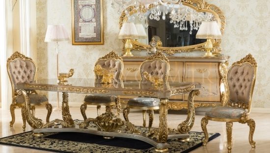 Большой обеденный стол Квин в стиле барокко. Стол выполнен из массива натурального дерева. Резные ножки покрыты паталью золотого цвета. Столешница украшена красивой интарсией (фреска по дереву). Такой стол будет красиво смотреться в интерьере гостиной в стиле барокко.