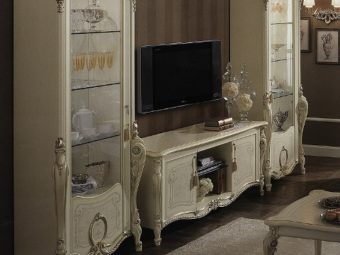 В продукции класса Luxury рекомендовано заранее просмотреть ассортимент витрин, чтобы оценить дизайн с ориентиром на материалы, цвет, габариты. В комплектации мебели от производителей, которую принято устанавливать в гостиной, столовой, могут использоваться: витражи, цоколь, антресоль, пленка (ПВХ, Оракал) нанесение пескоструйного рисунка. Многофункциональные гарнитуры с диодной подсветкой играют роль буфетов, используются шкафы и стеллажи для хранения предметов посуды, фарфоровых, керамических сервизов, аксессуаров, украшений.