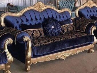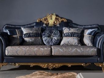 Синий раскладной диван с креслами в золотом дереве Патриций