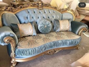 Классический резной раскладной диван в голубой ткани Марлен, Бел